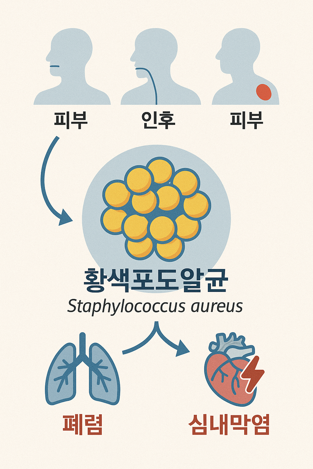 ν©μν¬λμκ· (Staphylococcus aureus)μ μ¬μ€ νμ 건κ°ν μ¬λμ μ½§μ, νΌλΆ, μΈν λ±μλ μμ°μ€λ½κ² μ‘΄μ¬νλ μΈκ· μ λλ€. λ¬Έμ λ μ΄ κ· μ΄ λͺΈμ κΉμ κ³³, νΉν νκ΄μ΄λ μ κ²½, λλ‘ λ€μ΄κ° κ²½μ°μ λλ€. μ΄λλ κ°λ ₯ν λ³μκ· μΌλ‘ λλ³ν΄ μΉλͺ μ μΈ κ°μΌμ μΌμΌν΅λλ€. λνμ μΈ κ°μΌ μ¬λ‘λ λ€μκ³Ό κ°μ΅λλ€: