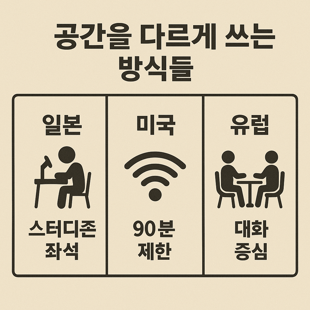 ํด์ธ ์นดํ ๋ฌธํ๋ ํ๊ตญ๊ณผ ๋ค๋ฅธ ์ ์ด ๋ง์ต๋๋ค. ํนํ ๋ฏธ๊ตญ๊ณผ ์ ๋ฝ, ์ผ๋ณธ์ ๊ณ ๊ฐ์ ํ๋์ ๋ฐ๋ผ ๊ณต๊ฐ์ ์ค๊ณํ๊ฑฐ๋ ์ด์ ๋ฐฉ์์ ๋ฐ๊ฟ์จ ๊ฒฝํ์ด ํ๋ถํฉ๋๋ค.