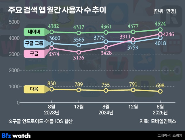 | ๊ฒ์ | ๋ค์ด๋ฒ | ๊ตฌ๊ธ | ๋ค์ด๋ฒ 4,524๋ง๋ช / ๊ตฌ๊ธ 4,246๋ง๋ช |