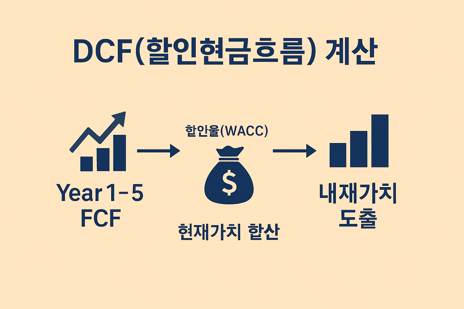 DCF(Discounted Cash Flow)๋ ๋ด์ฌ๊ฐ์น ๊ณ์ฐ์ ํต์ฌ ๋๊ตฌ์ ๋๋ค. ๊ธฐ์ ์ด ๋ฏธ๋์ ๋ฒ์ด๋ค์ผ ํ๊ธํ๋ฆ(Free Cash Flow)์ ํ์ฌ๊ฐ์น๋ก ํ์ฐํด ํฉ์ฐํ๋ ๋ฐฉ์์ ๋๋ค.